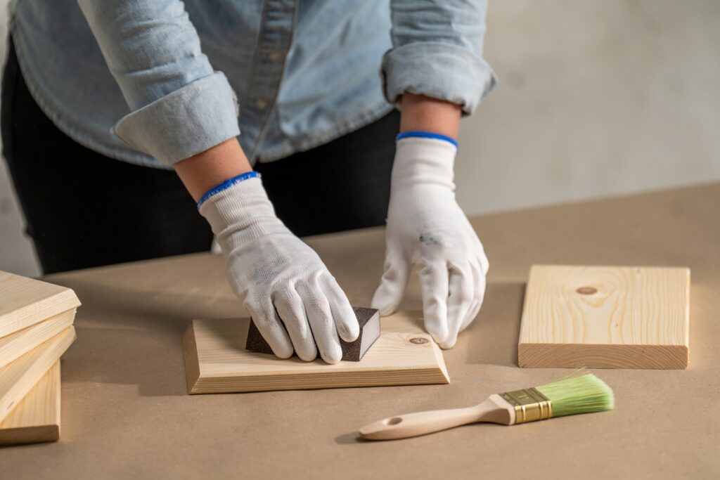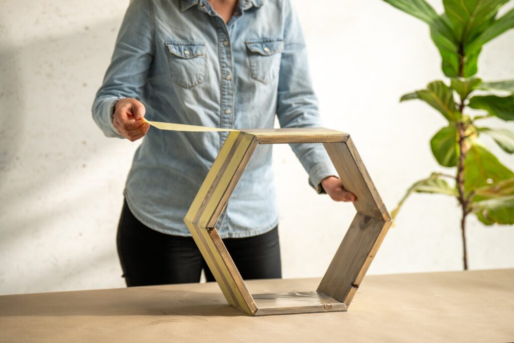 Dřevěné prkno * pokosovou pilu * lepidlo na dřevo * brusnou houbu * plochý štětec velikosti 1,5″ * krycí pásku * tenkovrstvou lazuru