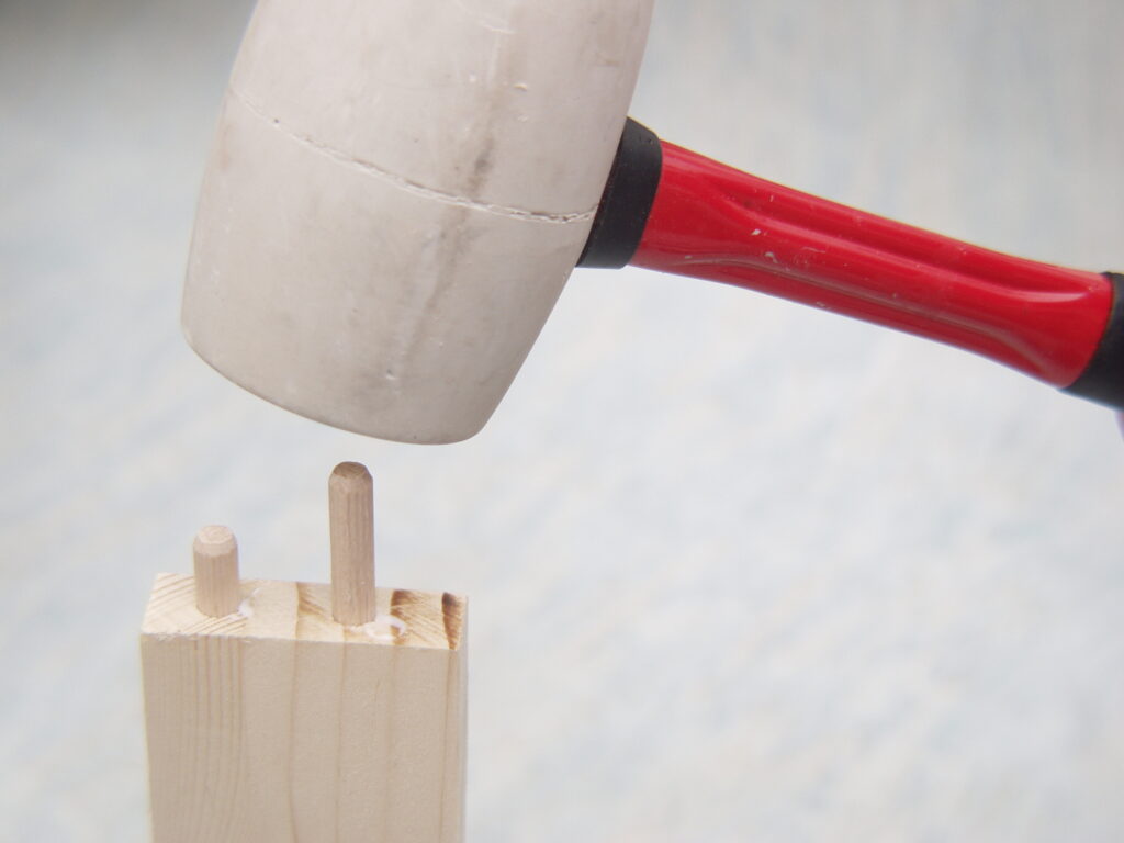 Do dílů vyvrtejte otvory pro spojovací kolíčky. Rámeček sklopné nohy sestavte tak, aby jedna vložená příčka byla asi o pět centimetrů odsazená a tvořila nožky.
